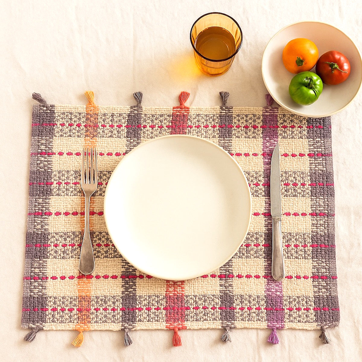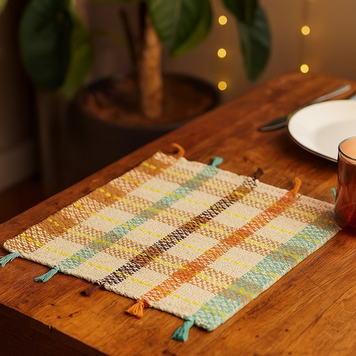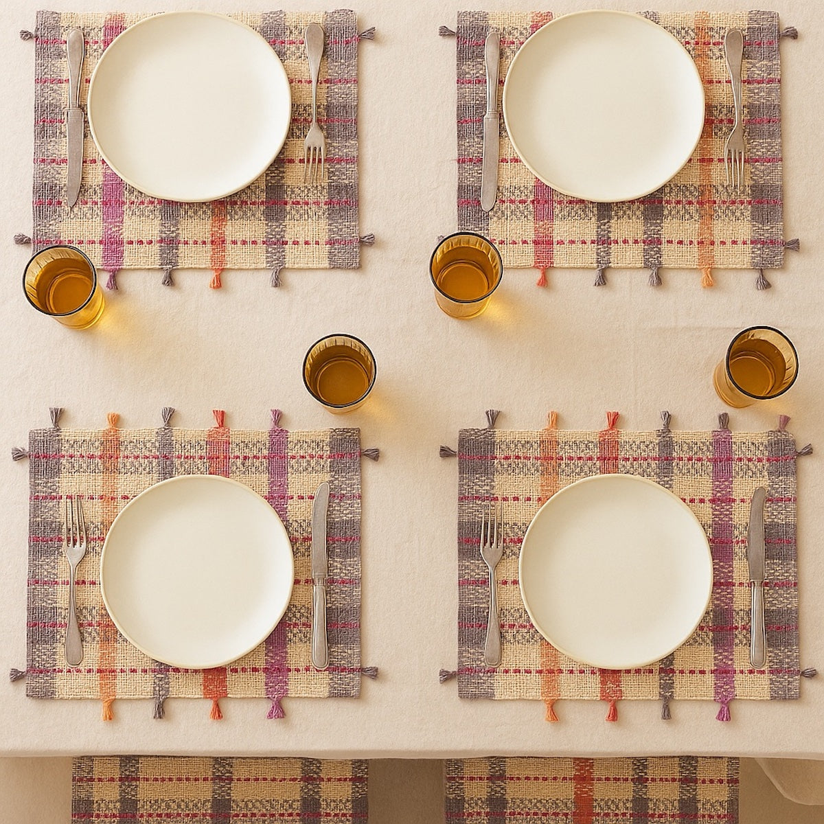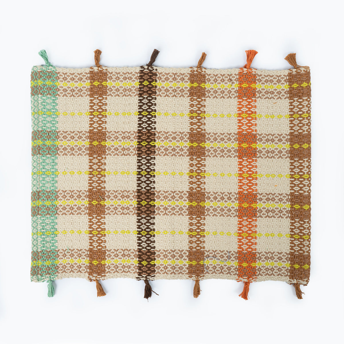 | Finishings | Hand made dyed tassels on both edges of placemat in alternating shades of colour that match with woven colour bands of the placemats. |