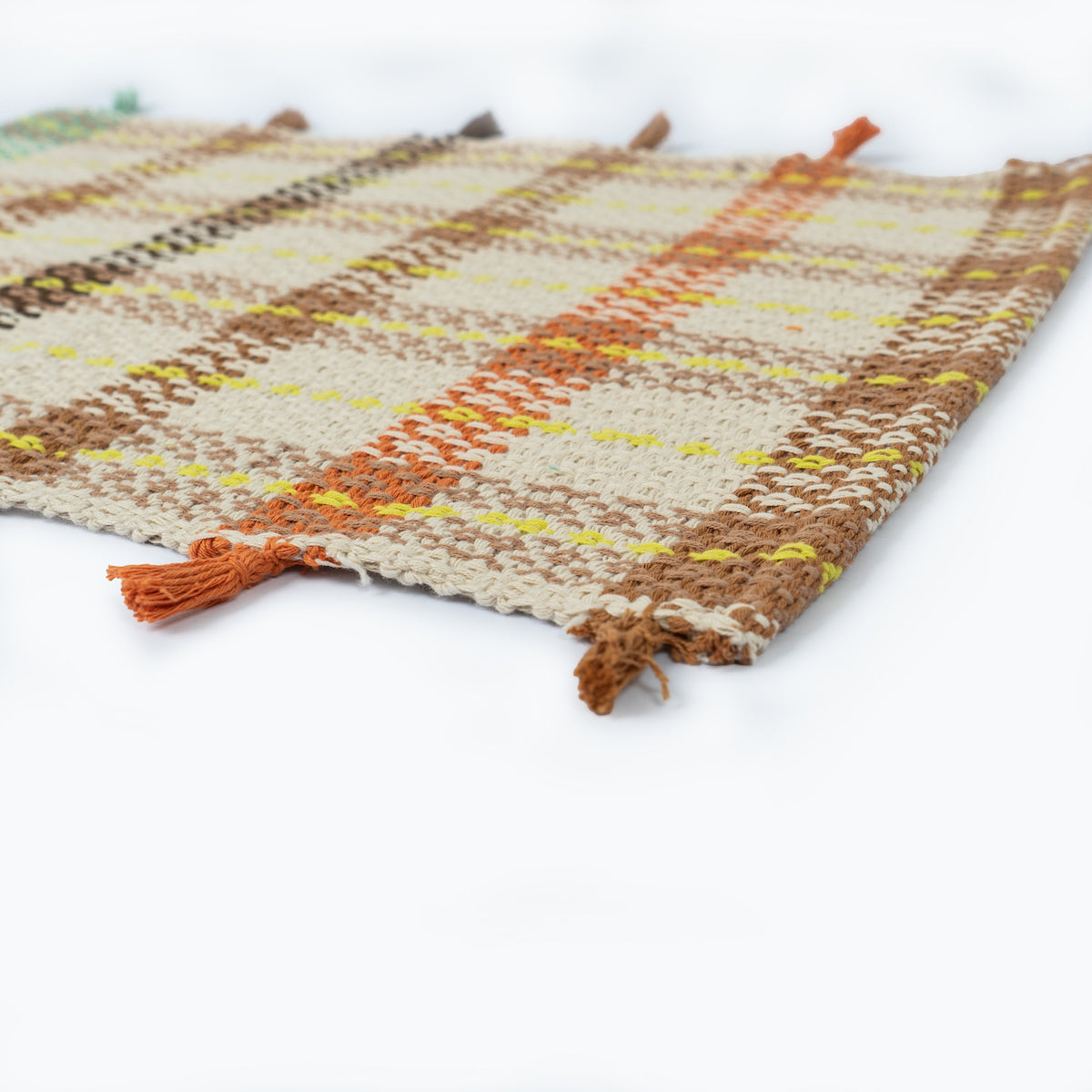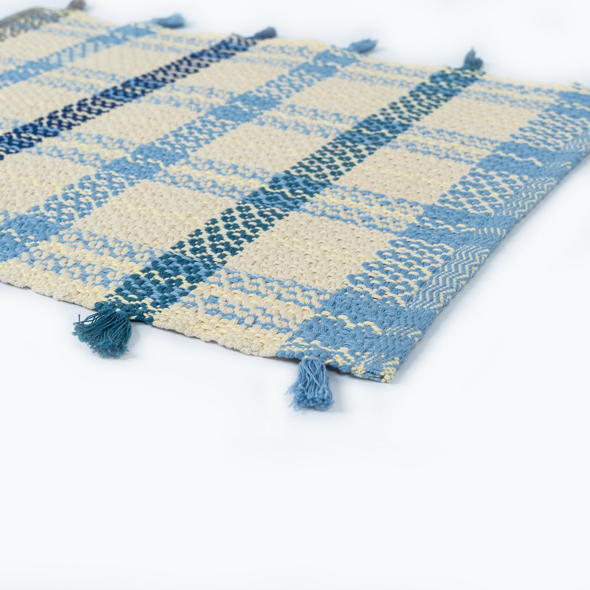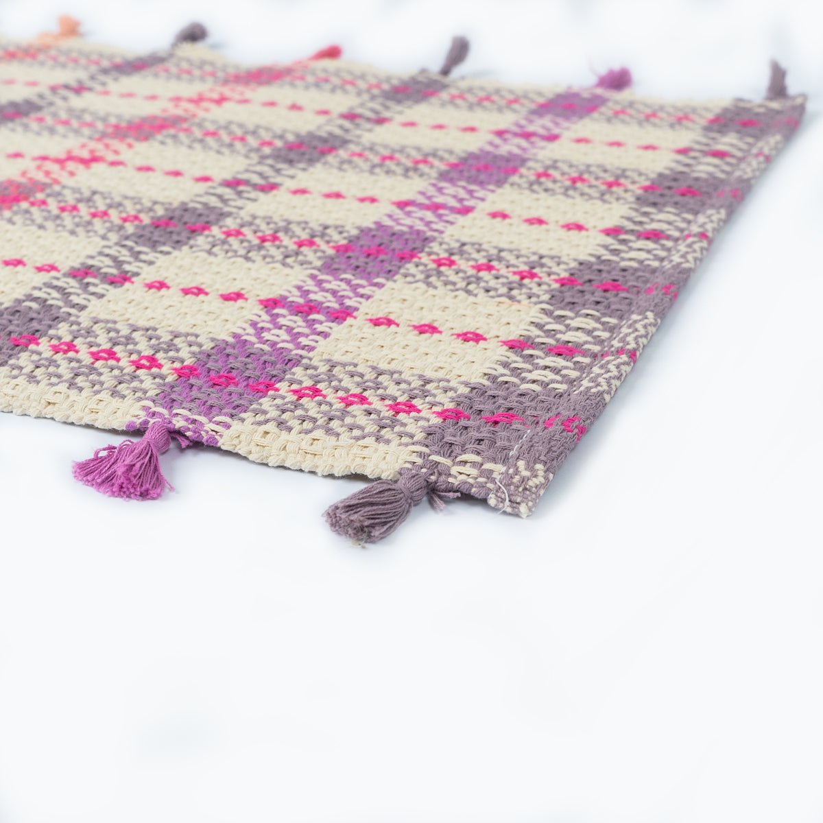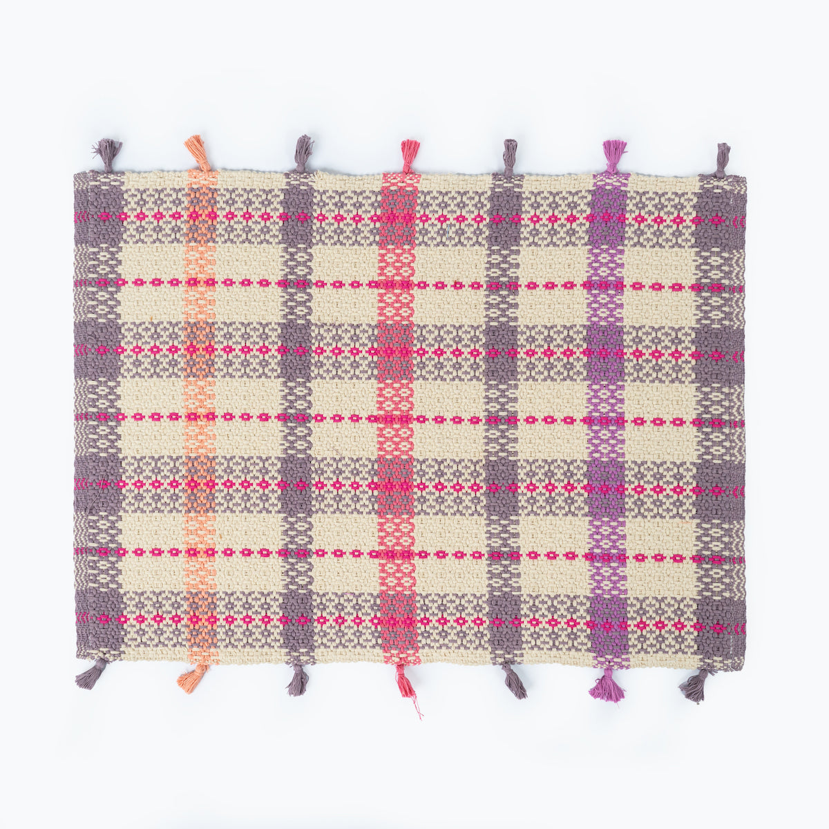 | Finishings | Hand made dyed tassels on both edges of placemat in alternating shades of colour that match with woven colour bands of the placemats. |