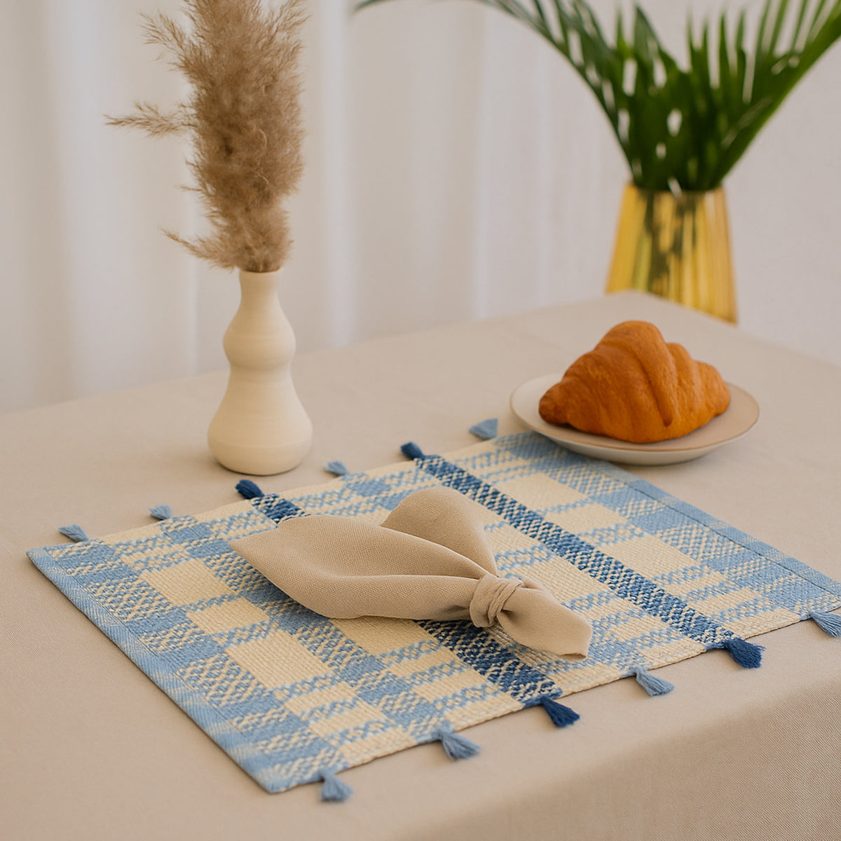 Bring warmth and texture to your tabletop with the Hala placemat— a beautifully handwoven piece that blends traditional craftsmanship with a fresh, modern palette. Featuring a soft grid pattern and delicate tassel detailing, it adds a cozy, artisanal charm to any setting. Available in Pink, Brown, and Blue, each colorway offers its own personality — from soft pastels to earthy neutrals — making it easy to mix, match, and style for every season.