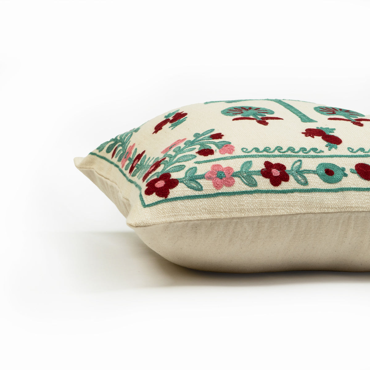 Inspired by the floral fauna of traditional Suzani, this embroidered cushion adds a touch of heritage and color to your space. The intricate palm tree and floral design, crafted in rich colored threads, creates a beautiful focal point against the soft natural base. Perfect for layering with solids or other patterned pieces, this cushion brings artisanal craftsmanship and timeless charm to your home décor.
